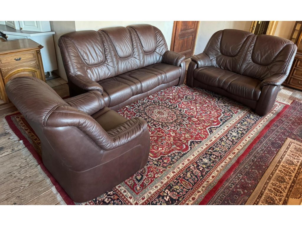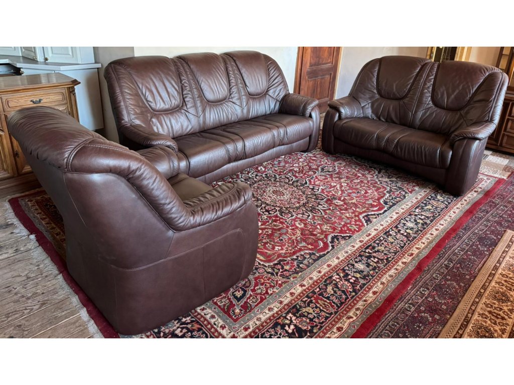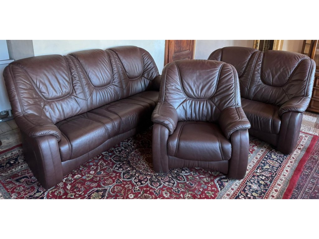 Nabízím k prodeji luxusní koženou sedací soupravu, v tmavě hnědé barvě.