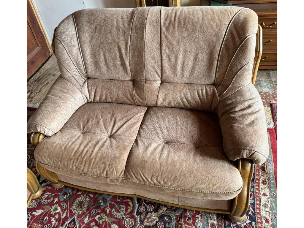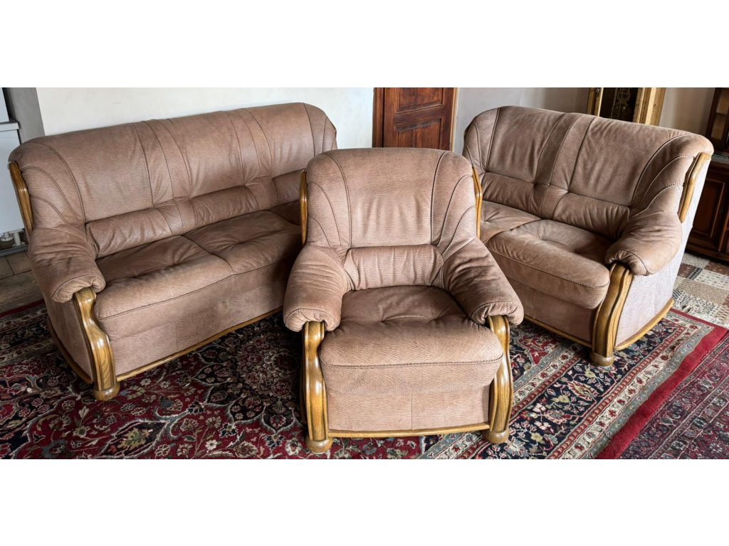 Nabízím k prodeji luxusní koženou sedací soupravu v kombinaci dřeva a broušené kůže.