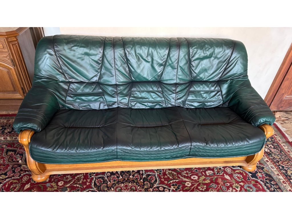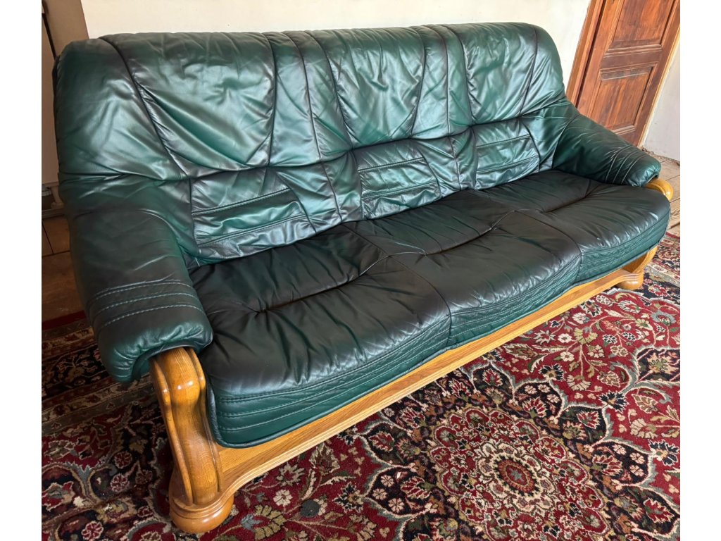 Nabízím k prodeji rustikální koženou sedačku - trojsedák v tmavě zelené barvě.
