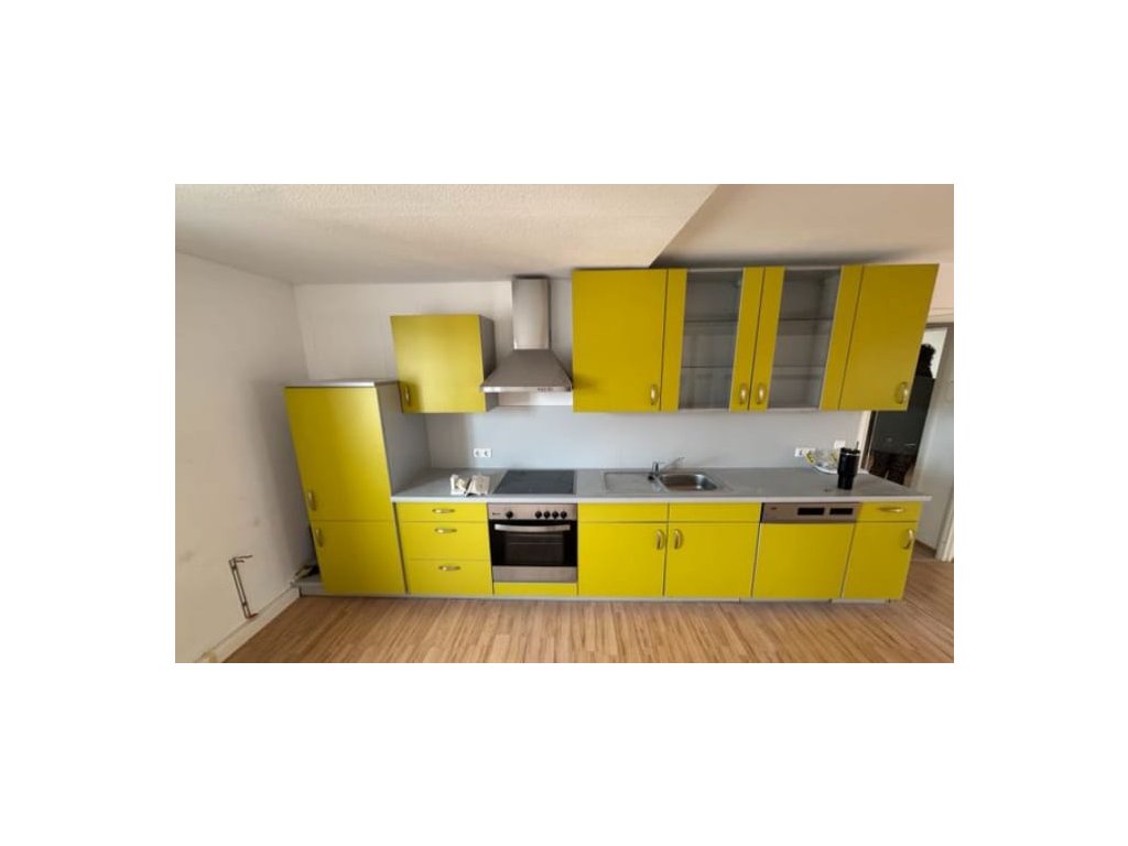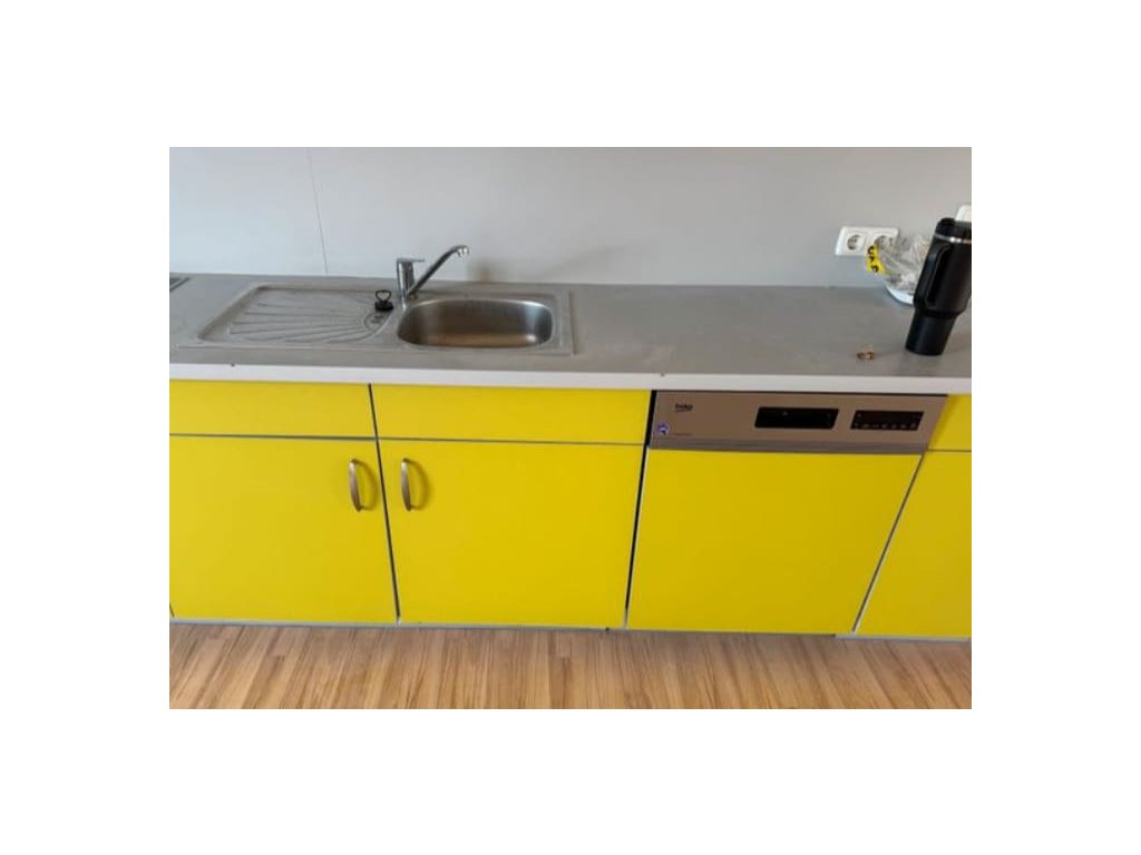 Nabízím k prodeji moderní žlutou kuchyňskou linku s vestavěnými spotřebiči.