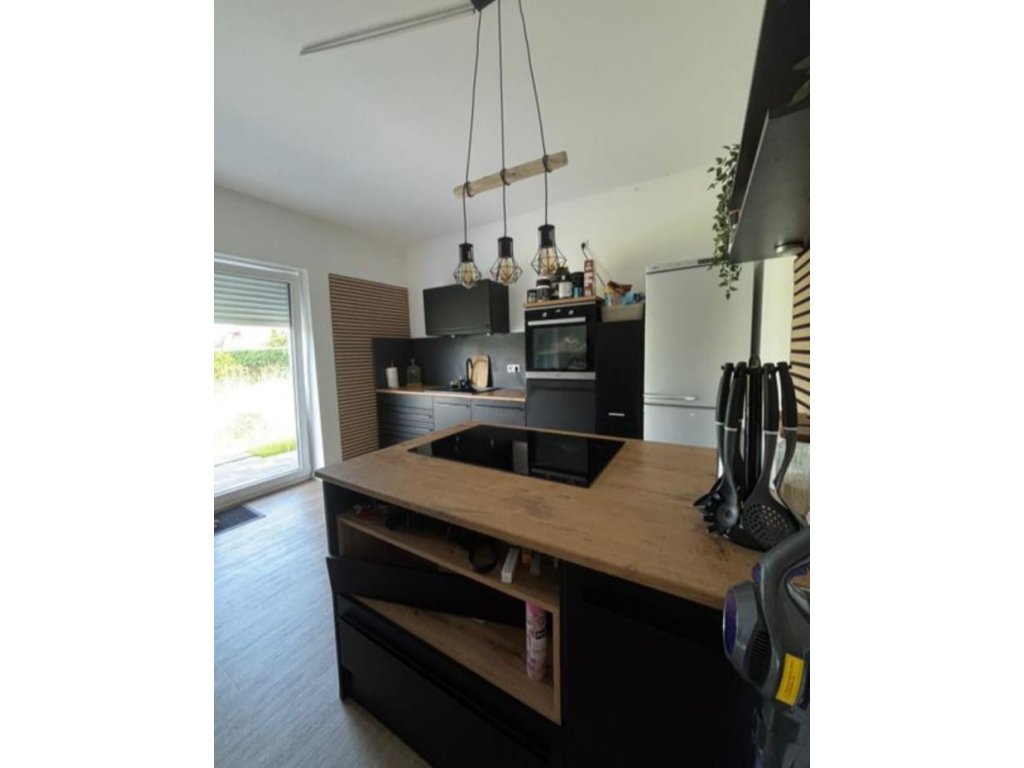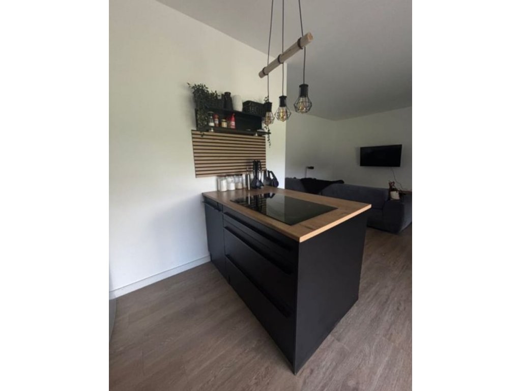 Nabízím k prodeji moderní černou matnou kuchyňskou linku s vestavěnými spotřebiči a kuchyňským ostrůvkem.