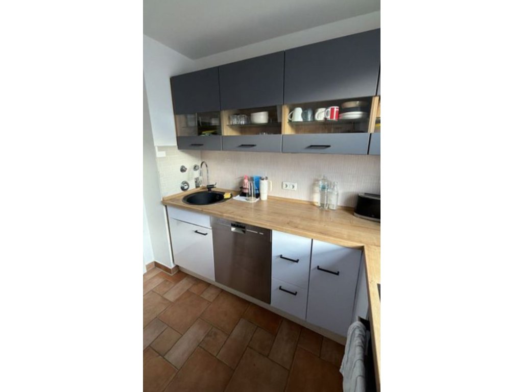 Nabízím k prodeji moderní šedou kuchyňskou linku s vestavěnými spotřebiči a pracovní deskou z masivu.