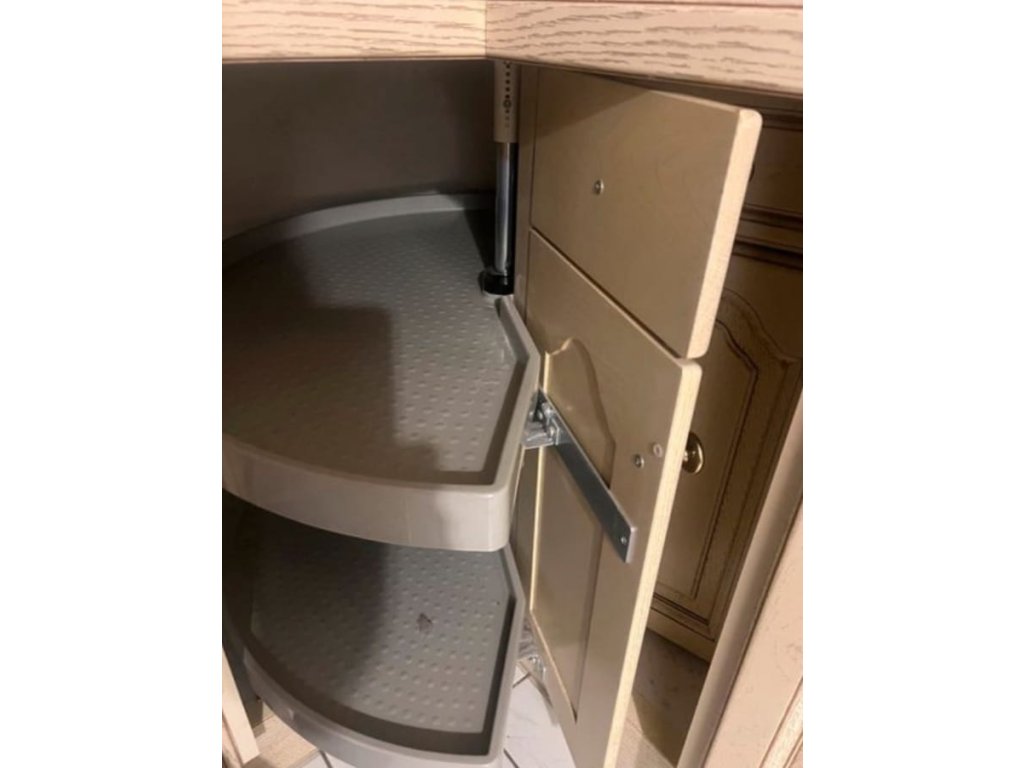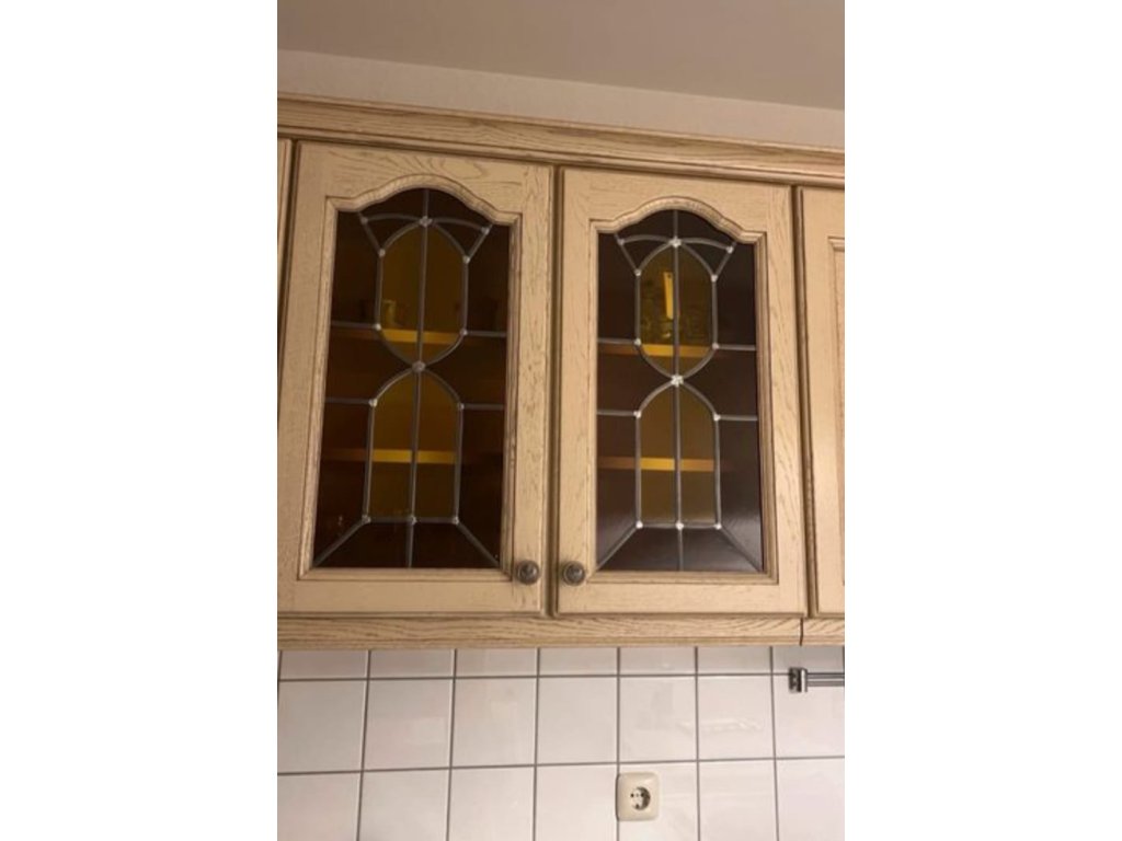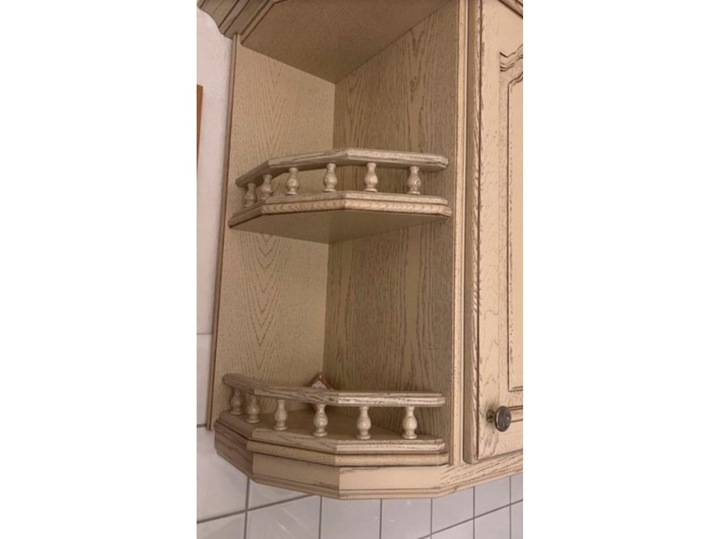Nabízím k prodeji krásnou světlou venkovskou kuchyňskou linku z masivu s vestavěnými spotřebiči a jídelnou.