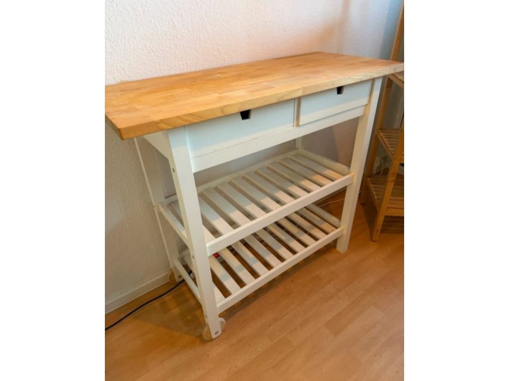 Nabízím k prodeji krásnou venkovskou kuchyňskou linku s pracovní deskou z masivu, s vestavěnými spotřebiči, přístavným/servírovacím stolkem a regálem.