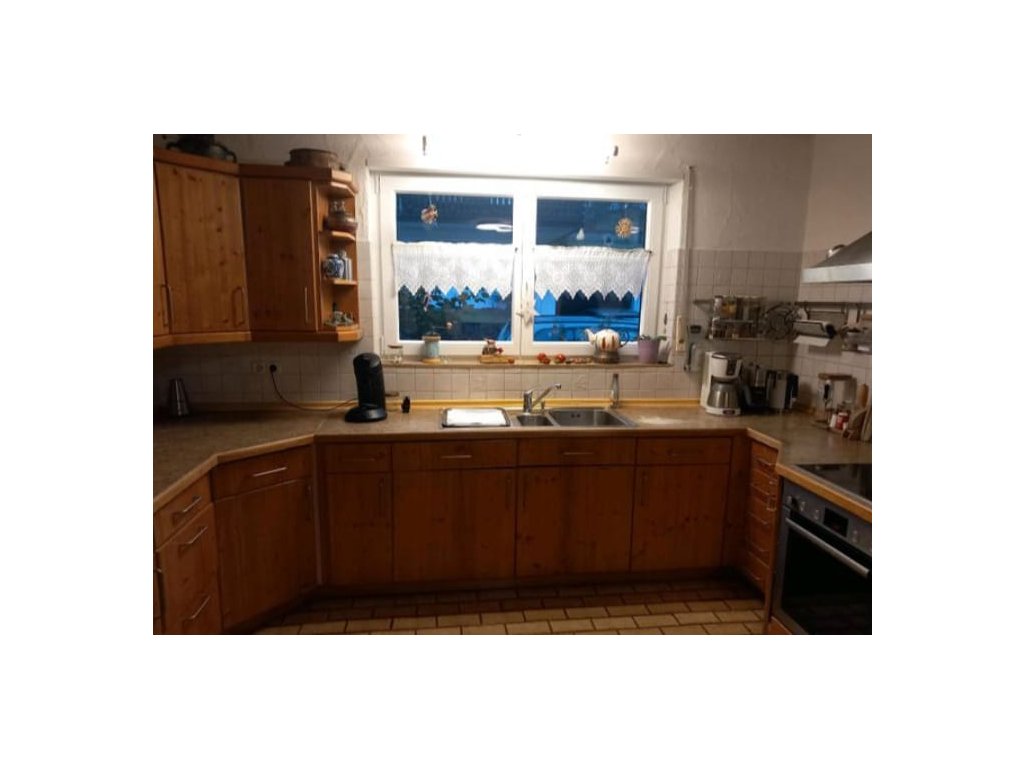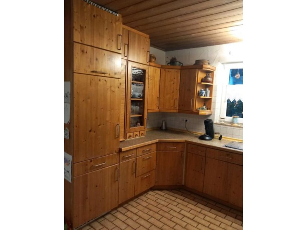 Nabízím k prodeji útulnou venkovskou kuchyňskou linku z masivu s vestavěnými spotřebiči.