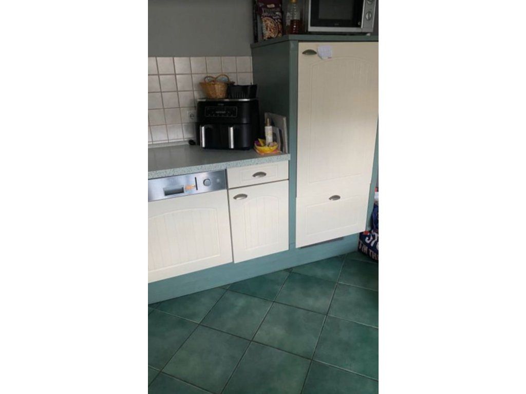 Nabízím k prodeji velmi pěknou venkovskou kuchyňskou linku v zajímavé barevné kombinaci krémová/zelená, s barem a vestavěnými spotřebiči.