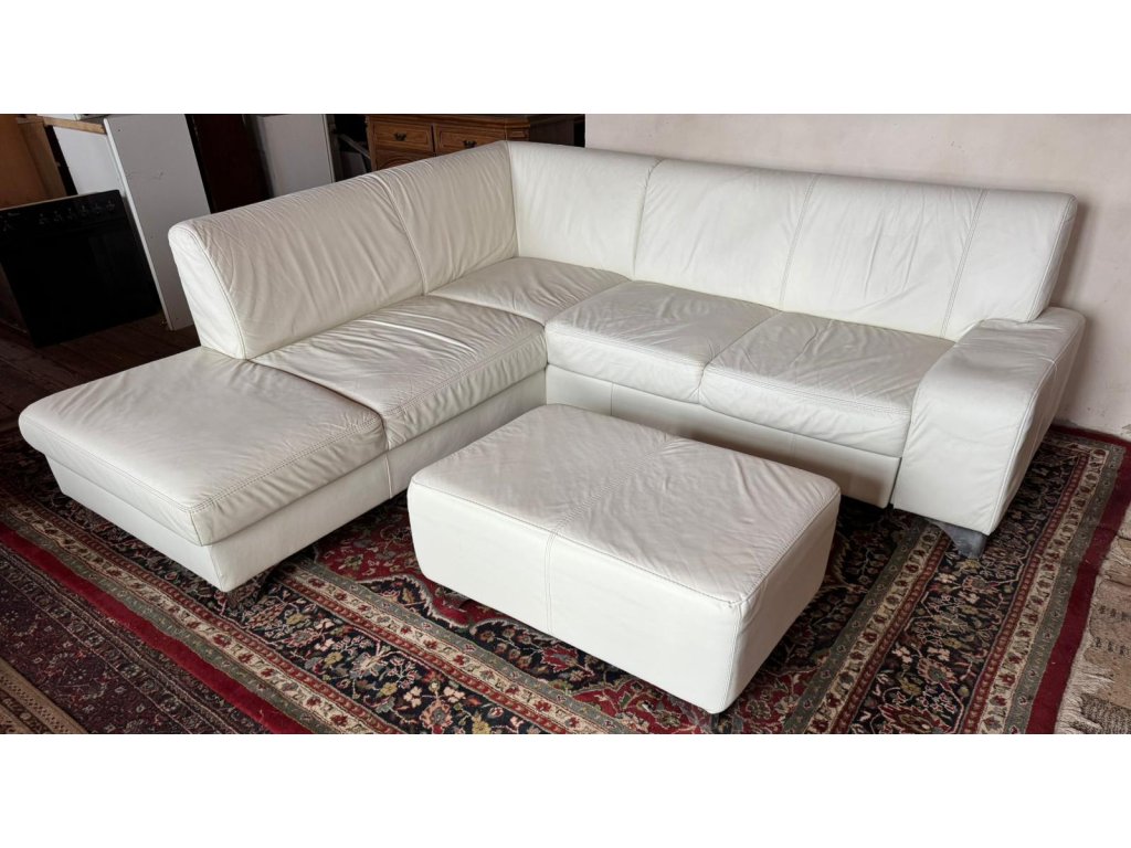 Nabízím k prodeji bílou koženou rohovou rozkládací sedací soupravu s taburetem.