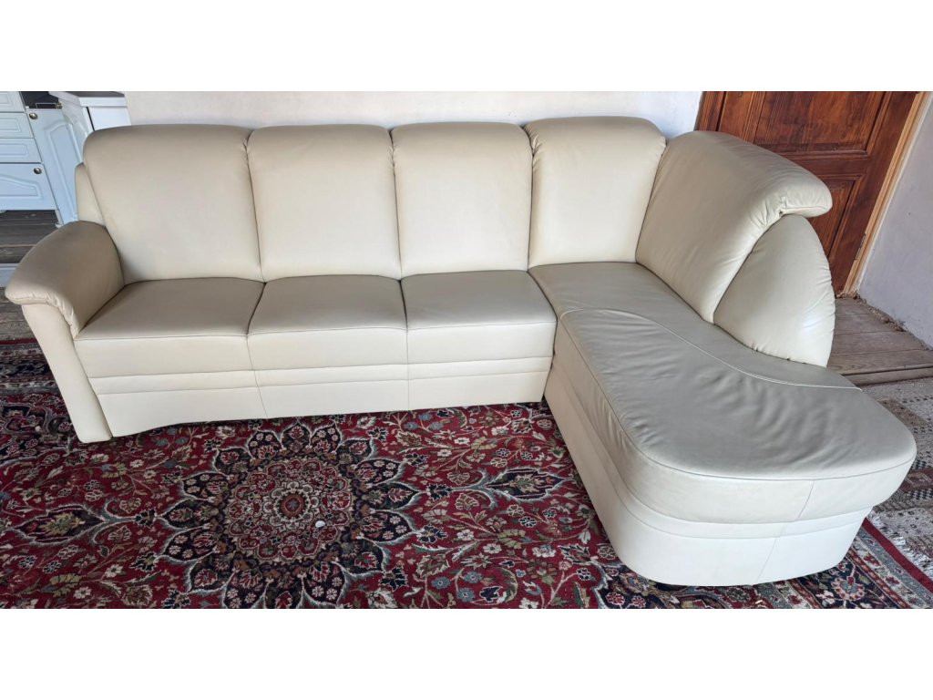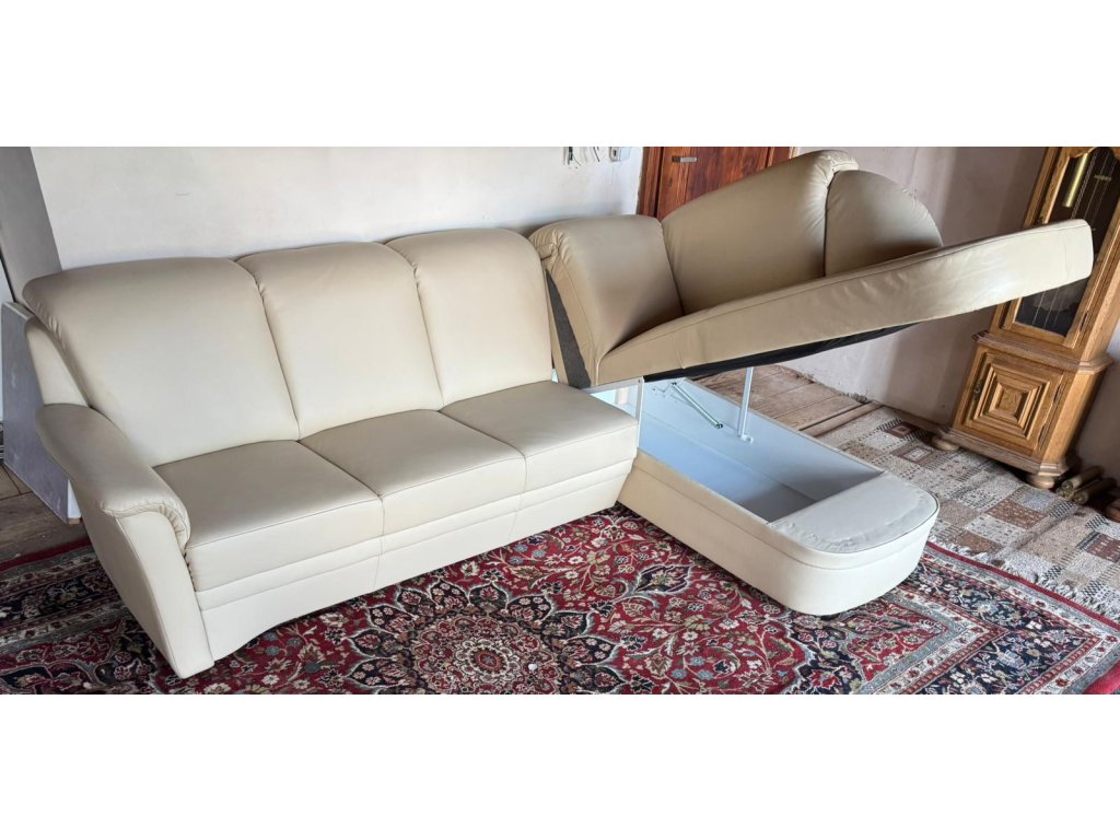 Nabízím k prodeji krémovou koženou rohovou sedačku s úložným prostorem.
