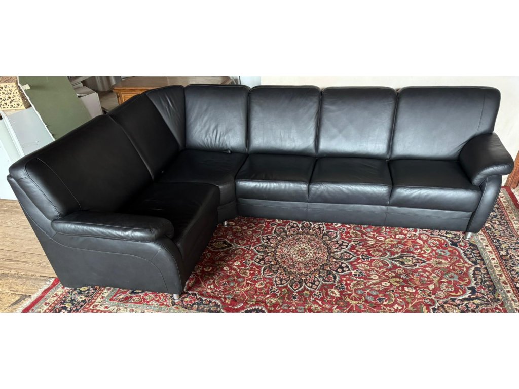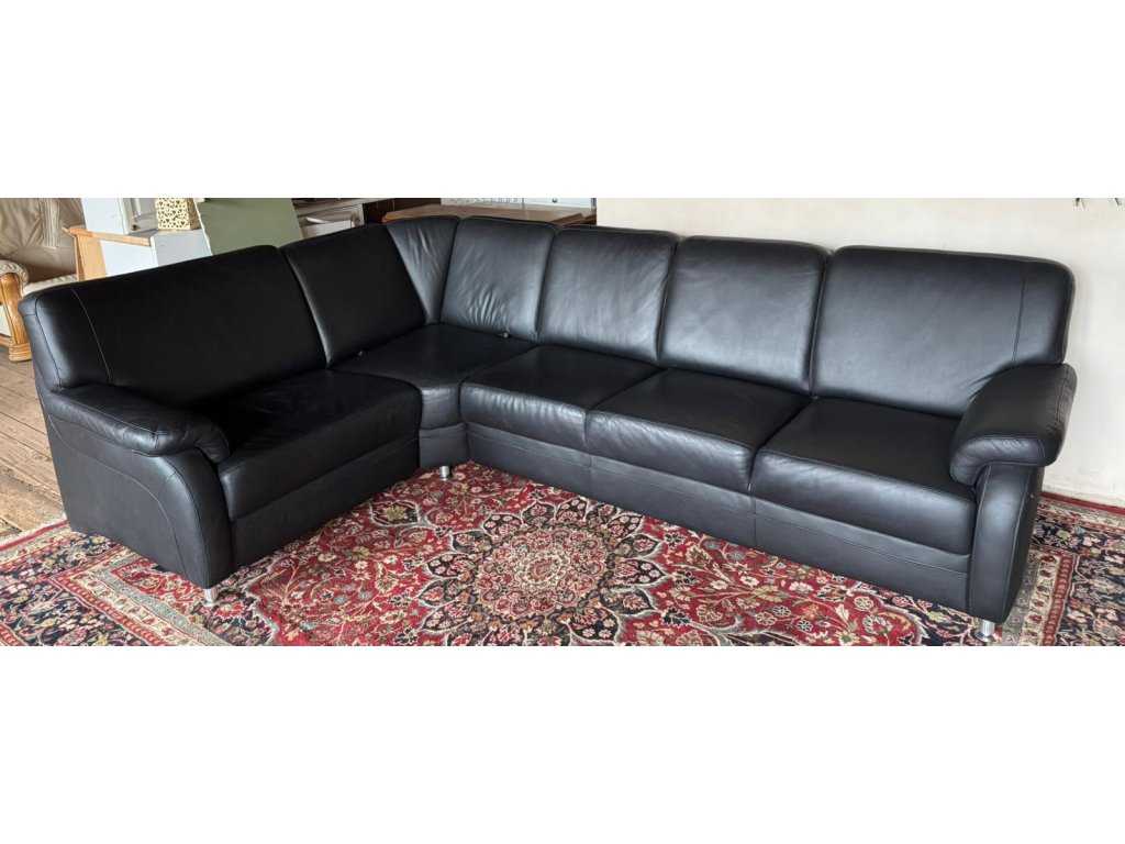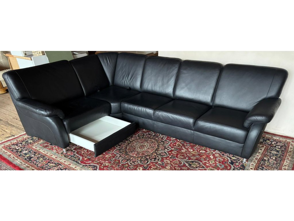 Nabízím k prodeji moderní černou rohovou koženou sedací soupravu s úložným prostorem.